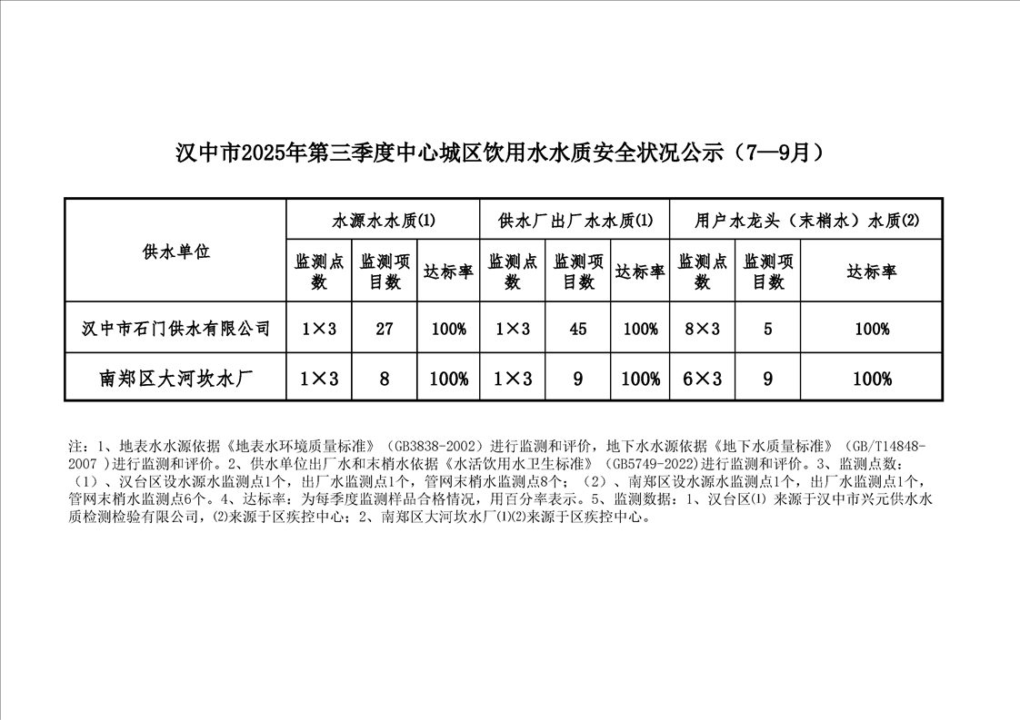 汉中市2025年第三季度中心城区饮用水水质安全状况公示(7—9月)